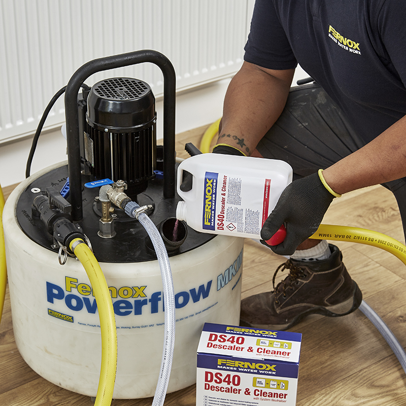 DS40 Descaler and Cleaner je rýchlo pôsobiaci kyselinový čistič navrhnutý na odstraňovanie vápenatého vodného kameňa alebo čierneho kalu a iných kontaminantov systému. Výrobok je ideálne používať počas preplachovania, kedy sa dá použiť aj na samostatné odvápňovanie výmenníka tepla či kotla. Dodáva sa s tekutým neutralizátorom